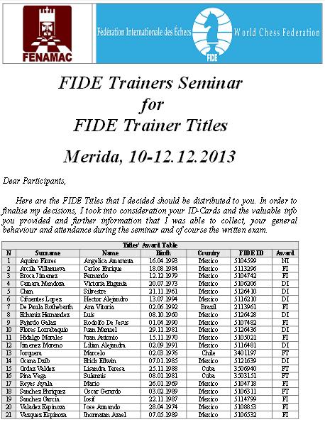 Fuera del rubro competitivo, tengo el gusto de comunicarles que durante el pasado Seminario de Entrenadores de la FIDE llevado a cabo en Mérida, Yucatán y conducido por el GM Alfonso Zapata, un contingente de la familia ajedrecística conocidos por todos entre los que puedo mencionar al MF (Pronto MI) Óscar Sánchez, Jonathan Vazquez Espinoza, Iosif Sánchez García y un servidor fuímos certificados por la FIDE como entrenadores e instructores de la misma.