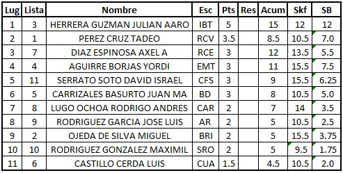 Y como buena película, el resultado final nos dejó prácticamente con las mismas dudas iniciales puesto que en la segunda ronda Enrique le gana a Jaime, en la tercera Isaí le gana a Enrique y en la cuarta Jaime le gana a Isaí dejando el resultado final en manos de los benditos y malditos desempates que repartieron los lugares en: 1ro. Isaí Torres, 2do. Enrique García y 3ro. Jaime Castilla quienes creo no hubieran tenido reparo en discutir los lugares de honor sobre tablero al ritmo que fuera y es que el espíritu de lucha de estos jóvenes es de destacarse ¡Un gran aplauso para ellos!
