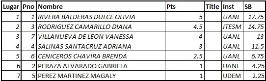 En la rama Femenil únicamente hubieron 7 competidoras de las cuales 5 pertenecían a la UANL, 1 al ITESM y 1 a la UDEM. Es un poco triste que a pesar de que cada Universidad puede inscribir a un máximo de 8 competidores por rama en este caso ni siquiera la escuela sede pudo reunir ese número de competidoras. Un pequeño foco rojo que nos avisa del creciente desinterés por las jugadoras en nuestro estado.
