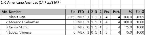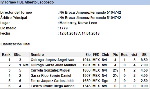 En el primer torneo válido para rating FIDE del año contamos con la participación del viejo lobo de mar, el Ingeniero Miguel Carrola González, el excampeón juvenil de Nuevo León Sergio Daniel Garza Rico, el muy joven pero ya experimentado Diego Castro Ovalle y los fuertes hermanos Juan Manuel Quiroga, Ángel Iván y Carlos Jahir, quienes durante las 5 rondas disputaron infinidad de interesantes duelos que los ayudaron a poner en práctica lo que han entrenado y se llevaron 5 fuertes partidas a un ritmo serio para analizar en casa.