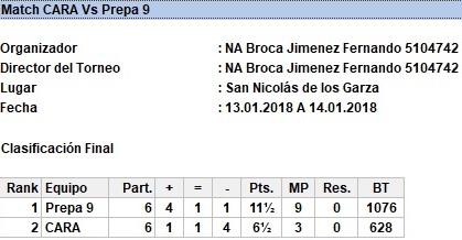 Como preparación al Estatal por Equipos de Secundaria los jóvenes del CARA se enfrentaron a un combinado de la Preparatoria 9 en un por equipos bajo sistema scheveningen, con la intención de enfrentar una dura oposición que los preparara para los más fuertes jugadores del estado. El resultado fué un duelo dominado por la Preparatoria 9 aunque en alguna de las rondas los jóvenes de secundaria se impusieron 2-1.