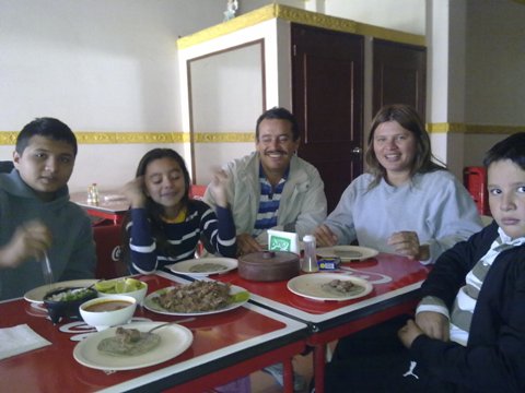 Desayunando animadamente una barbacoa acompañada de tortillas verdes.