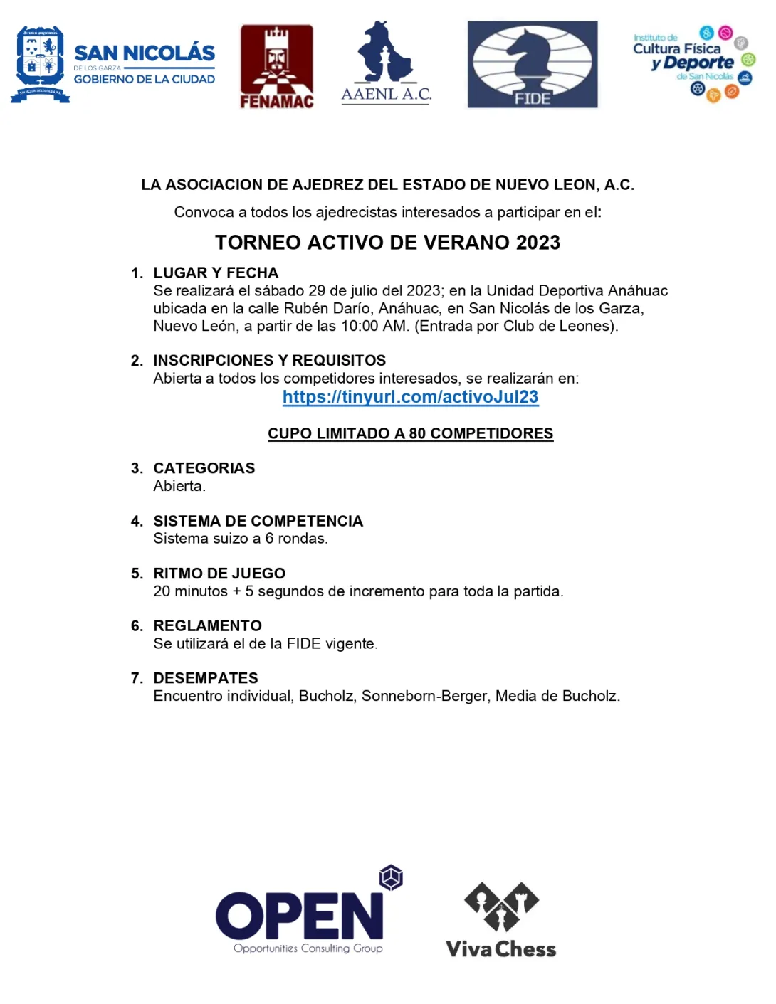 Nos complace invitarte al Torneo Activo de Verano este 29 de Julio en la Unidad Deportiva Anáhuac! Pon a prueba tus habilidades sobre el tablero y enfrentate a los demas ajedrecistas!