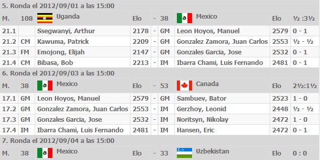 La ronda del Sábado se impusieron sin problemas 3.5-0.5 a Uganda y pudieron haber sido 4 con un Juan Carlos presionando hasta el último recurso contra su rival pero no pasando del empate. Contra Canadá Ibarra pierde por segunda ocasión en la Olimpiada mientras que Juan Carlos se ve forzado a rescatar medio punto de una posición un tanto comprometida. José González logra la victoria y Manuél León hace una verdadera hombrada durante el final de partida y es que hay que ver como maneja este verdadero Gran Maestro las piezas para convertir un final de dos peones en sexta contra Torre. Las partidas en el sitio oficial: http://www.chessolympiadistanbul.com/livegames/games.php?section=0&round=5&match=0