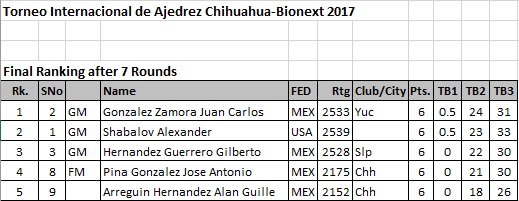 El día 4 de Octubre me toca partir rumbo a Chihuahua par arbitrar mi primer evento Internacional como árbitro principal y la alineación fue tremenda, hablar del currículum de cada uno de los participantes haría esta nota gigantesta por lo que me limitaré a mencionar a los primeros 5 rankeados: GM Alexander Shabalov, GM Juan Carlos González, GM Gilberto Hernández, MI Roberto Martín del Campo y MF Néstor Cofré, eternamente agradecido por la confianza del organizador, el MN Genaro Alvidrez y el AF Carlos Nevarez quién me recomendó para la labor.