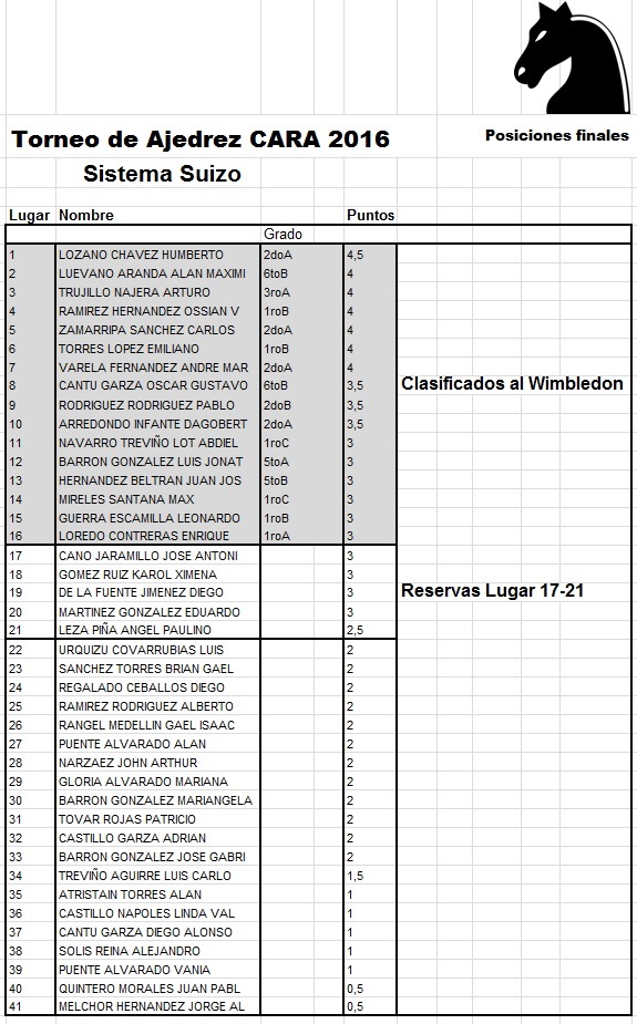 Reportando la reciente actividad ajedrecística el Centro de Alto Rendimiento Académico, que organizó su 1er Torneo de Ajedrez 2016 para sus estudiantes en nivel Primaria y Secundaria quienes compitieron a lo largo de 5 rondas en el sistema suizo buscando una de las 16 plazas para la fase Wimbledon final, esta idea fué tomada del vistoso formato que implementara el torneo Carlos Torre In Memoriam allá por el año 2001 y que lo consolidó coo uno de los torneos más grandes de todo el continente.