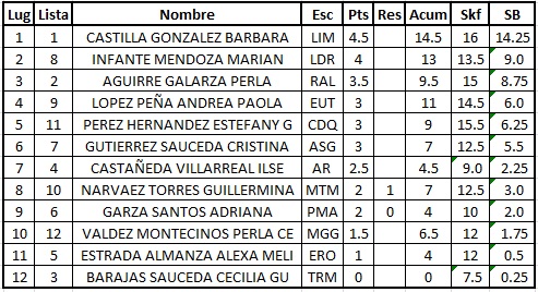 En la Sección Secundaria se pensaría que la ausencia de un pase a la fase Nacional desmotivaría un poco a los competidores pero nada más lejos de la realidad puesto que también nos topamos con muchos conocidos, la rama Femenil fué ganada por Vanessa Donjuan Pérez quién recientemente obtuviera la medalla de Bronce en la Categoría Sub-14 en el pasado Nacional Abierto. Vanessa acumuló 5 puntos en el mismo número de partidas relegando a Jimena Villanueva al segundo lugar, en tercero se ubicó otra gran conocida como Monserrat Basaldúa Vélez quién superó en coeficiente de desempate a otras tres competidoras.