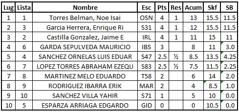 Y como buena película, el resultado final nos dejó prácticamente con las mismas dudas iniciales puesto que en la segunda ronda Enrique le gana a Jaime, en la tercera Isaí le gana a Enrique y en la cuarta Jaime le gana a Isaí dejando el resultado final en manos de los benditos y malditos desempates que repartieron los lugares en: 1ro. Isaí Torres, 2do. Enrique García y 3ro. Jaime Castilla quienes creo no hubieran tenido reparo en discutir los lugares de honor sobre tablero al ritmo que fuera y es que el espíritu de lucha de estos jóvenes es de destacarse ¡Un gran aplauso para ellos!
