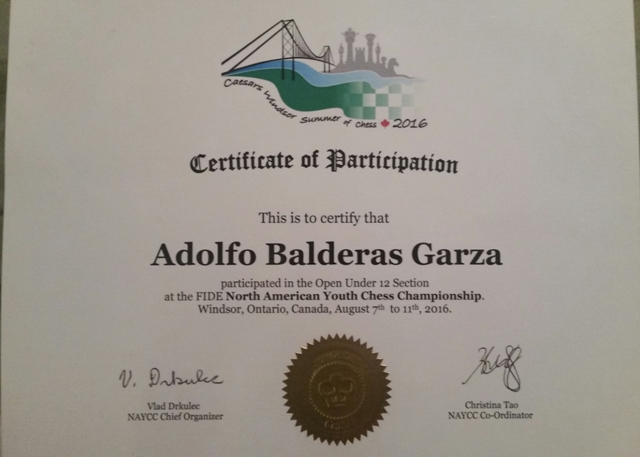 Representando a México en dicha categoria (sub12 abierta) jugaron mi hijo, Adolfo Augusto Balderas Garza (4 triunfos, 2 empates y 3 derrotas para 5/9, lugar 17) y Bryan Laurrabaquio Ramírez (3.5/9, lugar 41).
