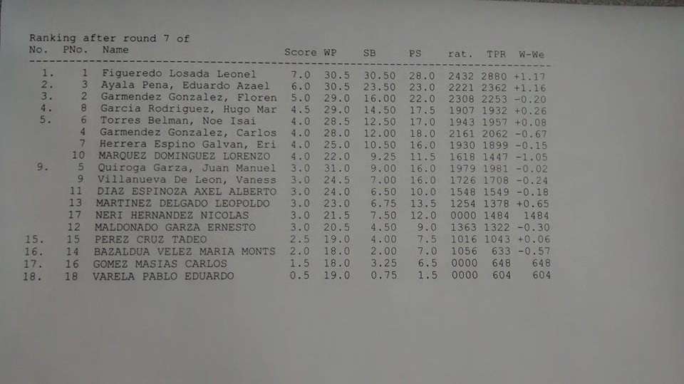18 jugadores se dieron cita para encontrar al más rápido de Nuevo León y al final 1 jugador se coronó con el 100% de los puntos, nos referimos al MF Leonel Figueredo Losada quien con 7puntos en igual número de rondas no dejó lugar a dudas de su habilidad en el Blitz, cabe mencionar que actualmente es el jugador con mejor rating en el Club que todos los viernes se reúne en el Dávila's de Las Puentes en San Nicolás de los Garza.