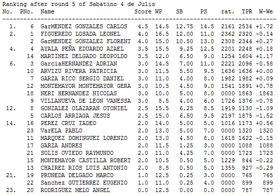 Nuevamente un torneo intenso que no se definió sino hasta la última ronda pues el MF Carlos Garmendez marchaba con 1 punto de ventaja sobre sus más cercanos perseguidores pero un traspiés de último minuto hubiera significado dejarse alcanzar por 3 jugadores más. Unas tablas en la ronda 5 sellaron su victoria y de momento es el máximo ganador de los Torneos Sabatinos a ritmo 10+5 con 2 por 1 de el MF Leonel Figueredo, siendo este último el ganador indiscutido del único Sabatino Blitz que se ha llevado a cabo.