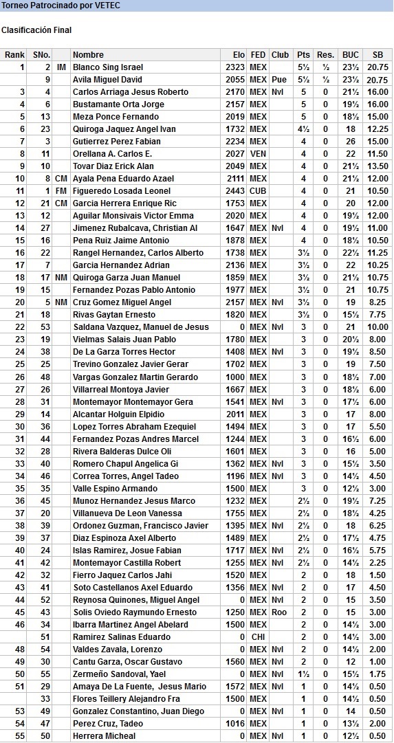 Las 6 rondas que comprendió el torneo fueron vertiginosas, desde la ronda 1 se sabía quienes eran los favoritos hasta que el contingente se cerró entre los fuertes jugadores locales: el CMy MN Azael Ayala y Jesús Carlos, los cubanos afincados en Nuevo León desde hace muchos años: el MF Leonel Figueredo y Fabián Gutiérrez y los visitantes de la Ciudad de México: el MI Israel Blanco y David Ávila, un fuerte cierre de estos últimos los llevó a la ronda 6 con 5 puntos y tras un acuerdo de tablas compartieron el primer lugar haciéndose con los premios en metálico de $3,000 y $2,000 con pases dobles para el Abierto GNP Seguros los días sábado y domingo, en tercera posición se colocó el local Jesús Carlos haciéndose acreedor al premio de $1,000 y 2 pases el día viernes.
