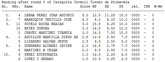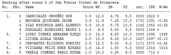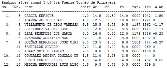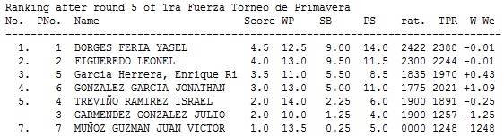 En 1ra Fuerza se contó con la presencia de los MFs Yasel Borges y Leonel Figueredo quienes hicieron el esperado 1-2, en 2da Fuerza Noé Carrizales de Cadereyta Nuevo León ocupó el primer sitio de un cuádruple empate en 3.5/5, 3ra Fuerza fué ganada por Enrique García, proveniente del Club Itinerante (Alameda-Extreme), mientras que en Juvenil destacó el joven Juan Antonio Lerma.