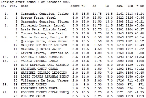 Y a pesar de que los líderes marcaron diferencia desde la ronda 3, para la ronda final se destacaba de líder el MF Carlos Garmendez, único jugador con 4/4 y el pareo lo enfrentaba al MF Leonel Figueredo si Carlos ganaba o entablaba quedaría campeón del 2do Sabatino si perdía, la primera posición la decidirían los desempates.