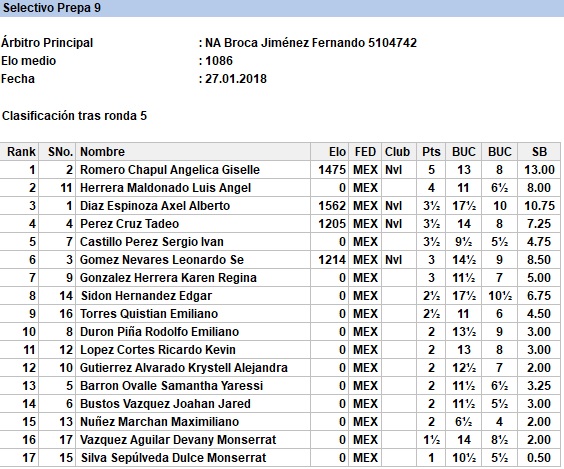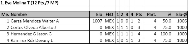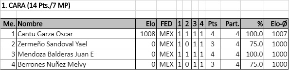 En el primer torneo válido para rating FIDE del año contamos con la participación del viejo lobo de mar, el Ingeniero Miguel Carrola González, el excampeón juvenil de Nuevo León Sergio Daniel Garza Rico, el muy joven pero ya experimentado Diego Castro Ovalle y los fuertes hermanos Juan Manuel Quiroga, Ángel Iván y Carlos Jahir, quienes durante las 5 rondas disputaron infinidad de interesantes duelos que los ayudaron a poner en práctica lo que han entrenado y se llevaron 5 fuertes partidas a un ritmo serio para analizar en casa.