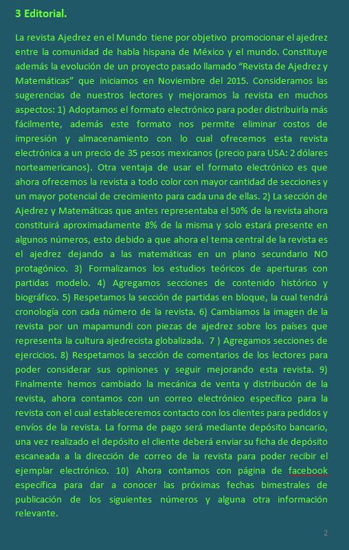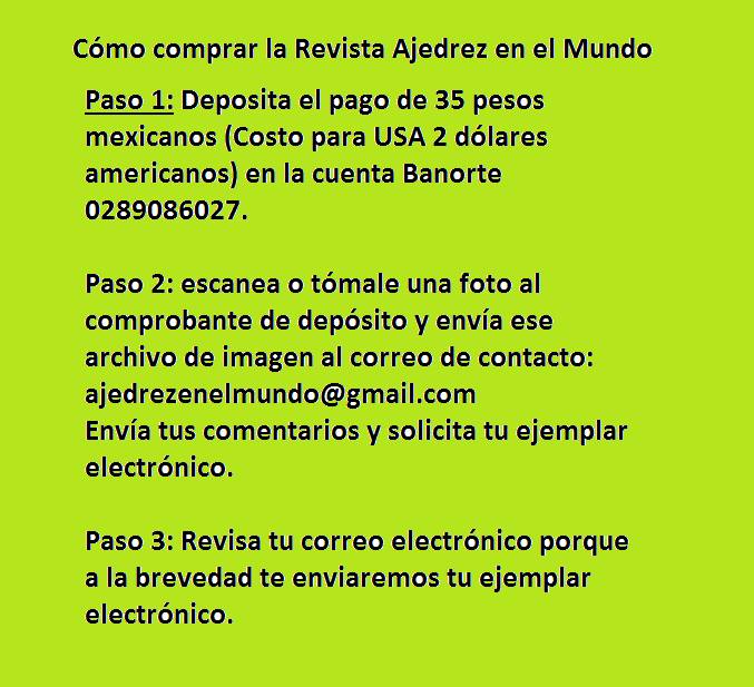 Les comento que la revista Ajedrez y Matemáticas ha evolucionado, ahora se llama "Ajedrez en el mundo" y es totalmente de ajedrez. Tiene formato electrónico y un costo de 35 pesos. La forma de comprar la revista es mediante depósito bancario. La información detallada para comprar la revista se encuentra publicada en nuestra página de facebook: