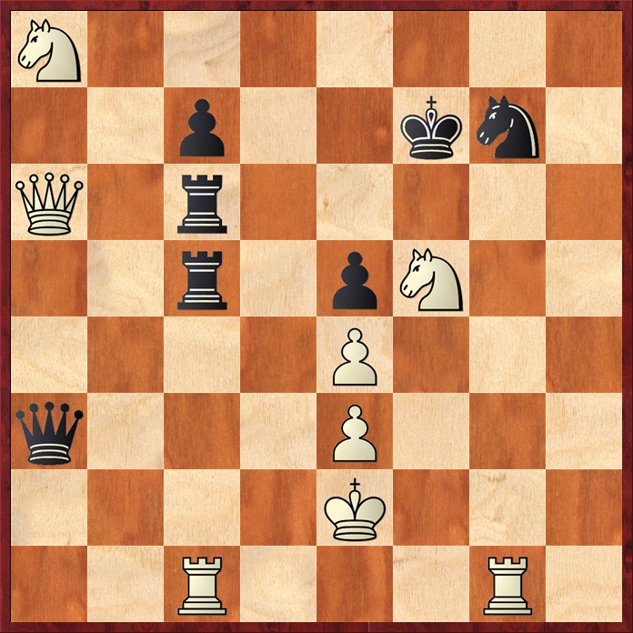 Después de muchas horas de un intenso juego, llegaron a esta posición donde Lucifer es Blancas y Santa Claus es Negras, donde el Diablo lleva 1 caballo de ventaja y le toca tirar por lo que los movimientos fueron los siguientes......