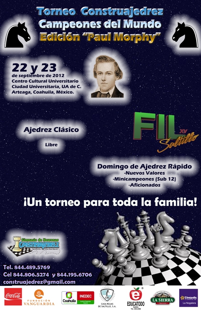 Adjuntamos convocatorias y promocional del Torneo Construajedrez Campeones del Mundo Edición Paul Morphy que realizaremos en la XV Feria Internacional del Libro Saltillo 2012 este 23 de septiembre.