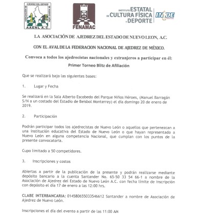 CLABE INTERBANCARIA: 014580655033546612 Santander a nombre de Asociación de Ajedrez de Nuevo León.